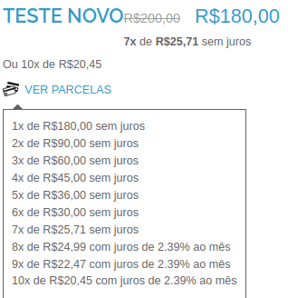Definir para que exiba as parcelas nas páginas de produtos/categorias, insira o valor da parcela mínima, número máximo de parcelas, número de parcelas sem juros e a porcentagem dos juros