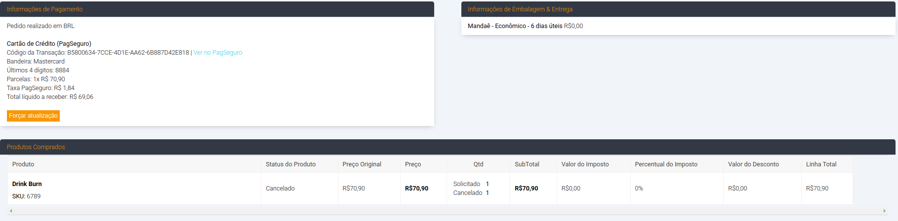 Note que o pedido ficará com o status de cancelado