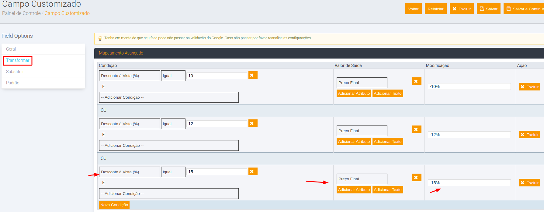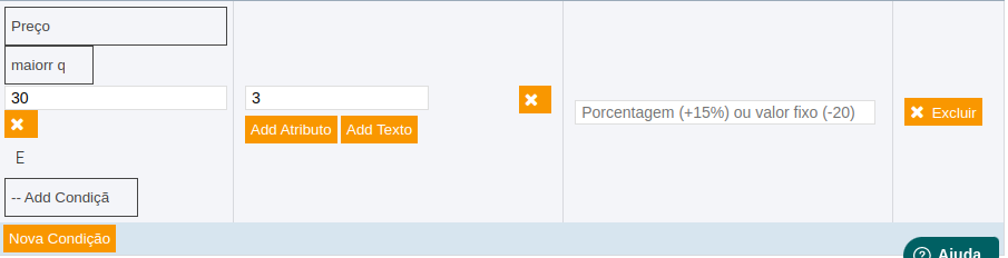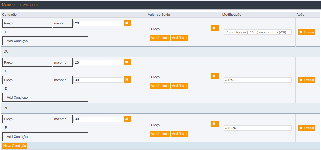 Irá configurar de acordo com o mesmo princípio acima, mas aqui em valor de saída iremos inserir o preço e em modificação a porcentagem equivalente da parcela