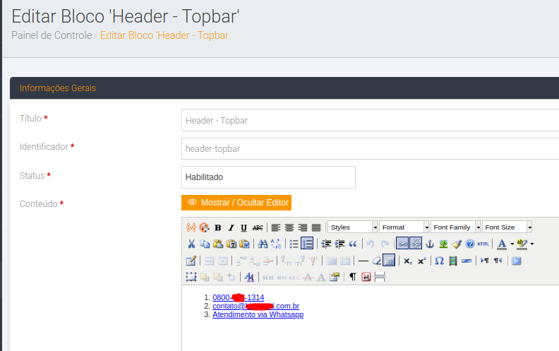 Note que abrindo este bloco será exibido o conteúdo deste bloco o qual você pode alterar ou editar o seu conteúdo ou inserir links