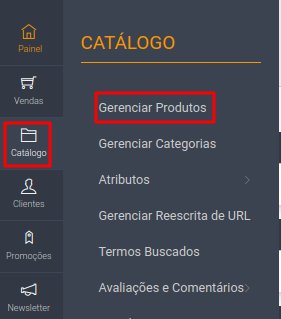 Primeiro clique em Catálogo > Gerenciar Produtos