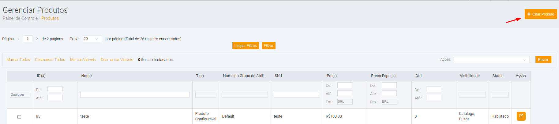 > Será exibida a lista de produtos de seu site. Para criar um novo produto clique em Criar Produtos