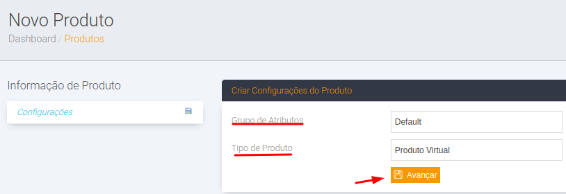 >Selecione a opção Produto Virtual, em seguida clique em Avançar.