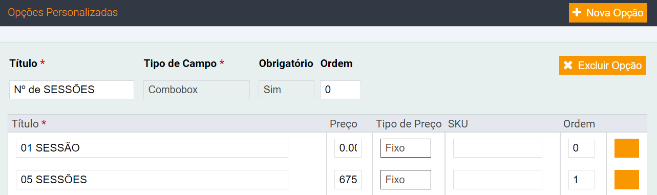 > E por último, o campo Ordenação que será preenchido se existir mais de uma opção personalizada para o mesmo produto, demonstrando então, em qual ordem você quer que as opções apareçam na página do produto.