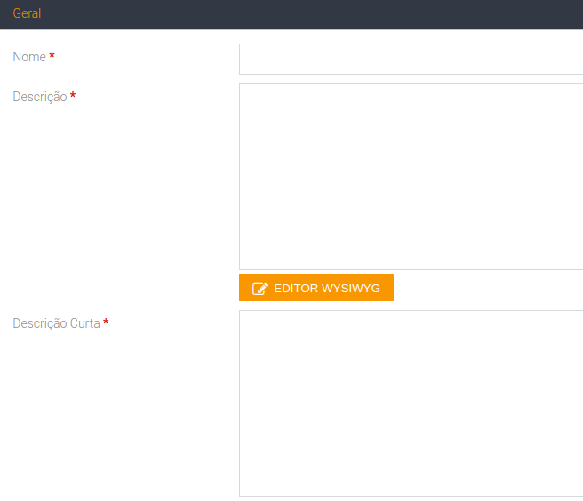 Aba Geral - Irá inserir o Nome do Produto, Descrição e Descrição curta