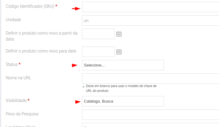 O Sku do produto (código identificador do produto - não inserir espaços ou caracteres especiais), em Status irá habilitar o produto, em Visibilidade setar como: Catálogo/Busca.