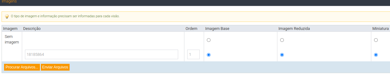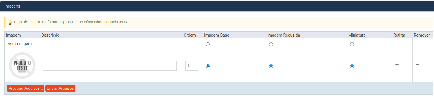 Atenção: Ao subir a imagem, verificar se não esta setado (sem imagem) caso tiver, setar na imagem que subiu a: imagem base, reduzida e miniatura